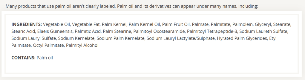 I thought that I would be easily able to identify palm oil in products by just looking at the label. Upon my research, I was shocked to discover at least another 400 names that palm oil and its derivatives can be listed as and in some countries, simply as ‘vegetable oil’. With Australia’s current labelling law, manufacturers are allowed to label palm oil as vegetable oil.