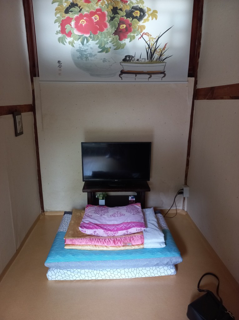 I booked to stay a night in a hanok and ended up at the Gongsimga Hanok Guesthouse. The single room was roomy enough for a single fold out mattress and space to put your belongings. There was a TV, air conditioning and a heater inside to accommodate all the seasons. For the single room, the bathroom was located across the courtyard which I didn’t mind. There were 4 rooms in total that guests could book.